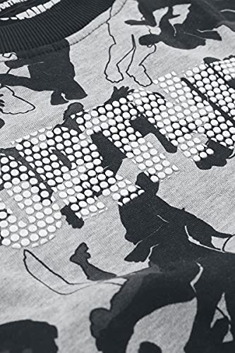 - Diseño: esta parte superior gris melange tiene un estampado de camuflaje compuesto de siluetas de cráneo y el logotipo de Fortnite de puntos blancos se coloca en el pecho. Las bandas en blanco y negro en el brazo unen el diseño de la escala gris perfectamente.