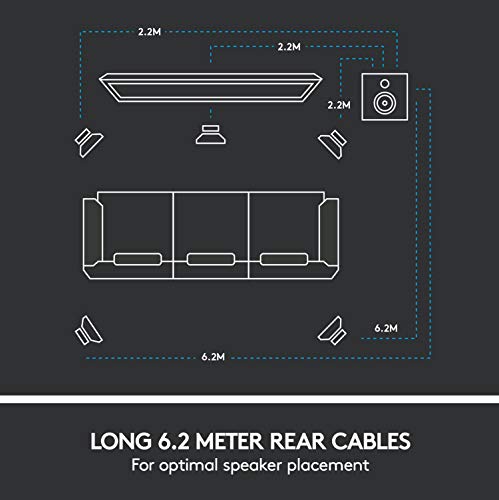 - Flexibilidad de Colocación: Con cables extralargos de 6,2m para cada altavoz satélite posterior, no te hará falta reorganizar la casa para disfrutar de audio optimo
