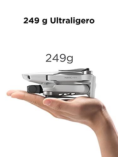 - Características: DJI Mavic Mini, portátil y compacto, pesa 249 gr, por ello está incluido en la clase de peso más baja y más segura de los drones, ofrece 30 minutos de vuelo con una carga completa