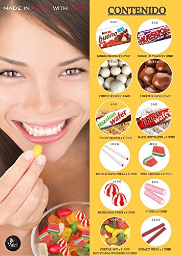 - CONTIENE: Kinder Bueno, Huesitos Valor, ChocoWafer, Hazelnut, 2 Chocobolas, 8 tipos gominolas Vidal