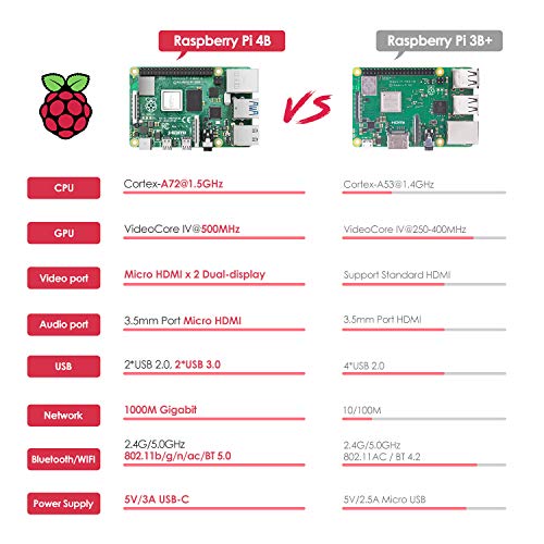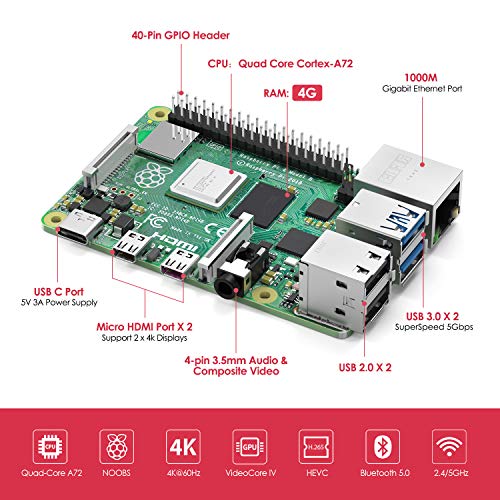 - ?️【Muy Potente】Raspberry Pi 4 Modelo B con CPU de cuatro núcleos A72 a 1.5Ghz, New Soc BCM2711. Nueva actualización basada en Raspberry Pi 3 B. Ancho de banda triplicado (cableado e inalámbrico) y capacidad para mantener un alto rendimiento durante un tiempo alargado. LAN inalámbrica de 2,4 GHz y 5 GHz 802.11b / g / n / ac y Gigabit Ethernet de velocidad completa.