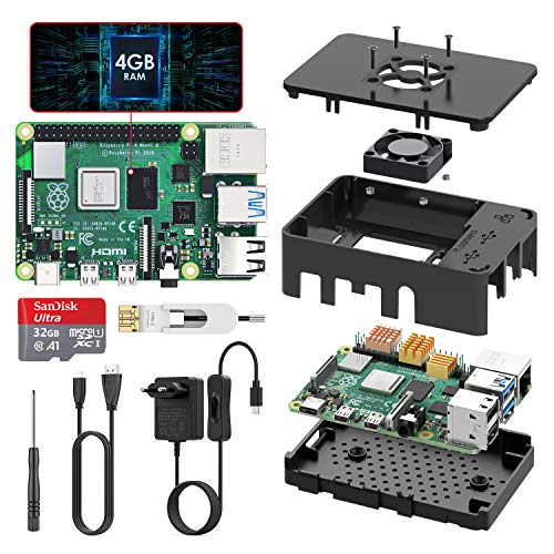 - ?️【Accesorios completos】Gracias a los accesorios equipados, puede poner el Raspberry Pi 4 cuando se entrega: 1 x Raspberry Pi 4 Modelo B 4GB, 1 x fuente de alimentación 5V 3A con interruptor, 1 x tarjeta Micro SD precargado con NOOBS, 1 x estuche negro para Pi, 1 x ventilador, 3 x disipador de calor, 1 x lector de tarjetas Micro SD (USB-C y USB-A), 1 x micro cable HDMI a HDMI, 1 x destornillador , 5 x tornillos, 5 x tuercas, 1 x tarjeta de garantía.