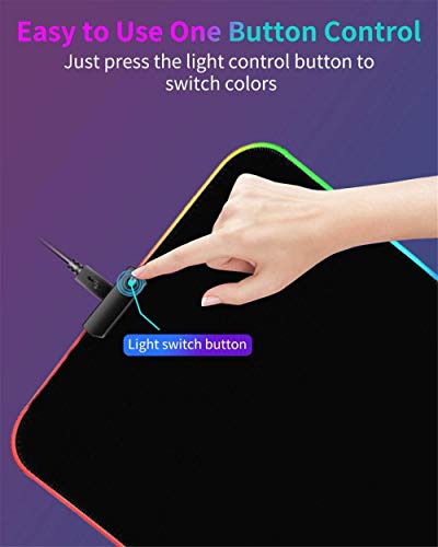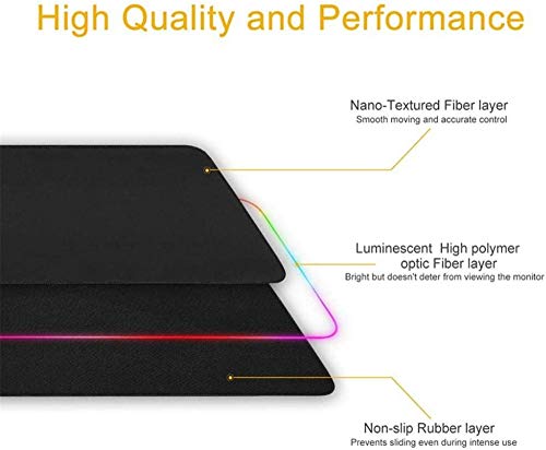 - Inmersión RGB definitiva: 7 modos estáticos, 2 modos dinámicos, esta alfombrilla de ratón para juegos con 14 opciones de iluminación traerá colores vivos a la configuración de su escritorio. Fantástica alfombrilla de ratón RGB para juegos para decorar la mesa de juego de tu PC. Será muy agradable utilizar esta alfombrilla de ratón con una iluminación fresca. Si necesita una alfombrilla de mouse RGB para su mouse y teclado, ¡ha venido al lugar correcto!