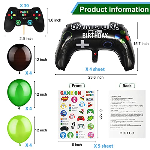 - Contenido del paquete: obtendrá 1 pieza de cubiertas de mesa con temas de videojuegos, 1 pieza de fondo, 125 piezas de tatuajes temporales en 5 hojas, 30 piezas de decoración para cupcakes, 4 piezas de globos de control y 12 piezas de globos de videojuegos, decorando mejor su fiesta de videojuegos
