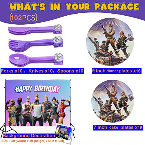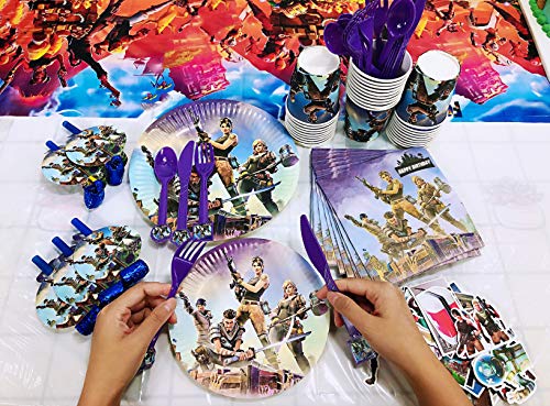 veeyiki Suministros para Fiesta de Cumpleaños para Fanáticos de Juegos,Pancarta,Plato,Taza,Servilleta,Mantel,Cuchara,Tenedor,Cuchillo,Soplador y Fondo para Chicos
