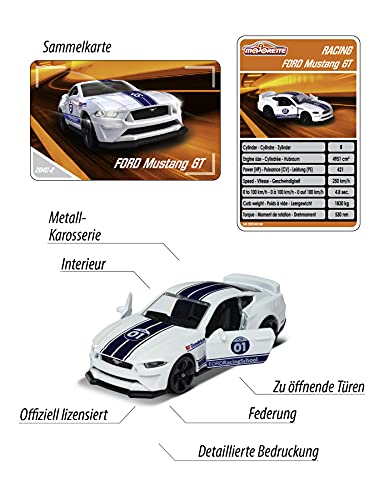 Majorette 212084009Q15 Racing Ford Mustang GT - Coche de Juguete, Rueda Libre, Piezas de Apertura, 7,5 cm, Color Blanco/Azul, para niños a Partir de 3 años