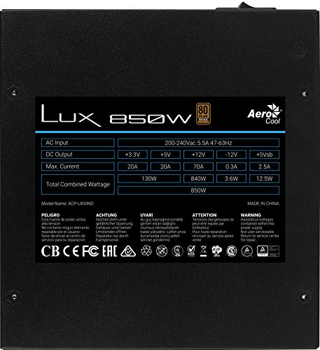 Aerocool LUX850, Fuente Alimentación PC 850W, 80 Plus Bronze 230V 88% Efic, APFC
