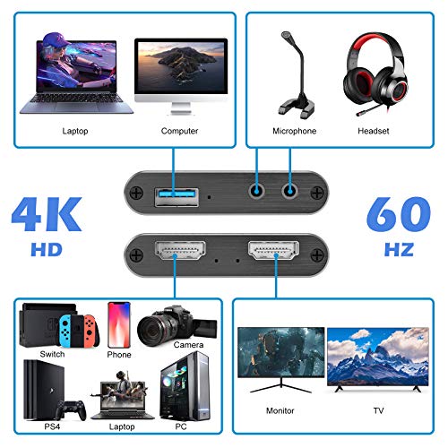 - 【Capturadora Video de Amplia Compatibilidad】 Esta tarjeta capturadora 60fps está equipada con 5 puertos: puerto usb 3.0, entrada y salida HDMI, entrada de micrófono, salida de audio. El dispositivo es compatible con múltiples aplicaciones de terceros como VLC, Quicktime, OBS, Amp; con presentación directa en windows, android, Mac OS X, video 4 linux en linux, con soporte de visualización de audio y pantalla ancha
