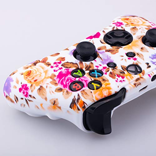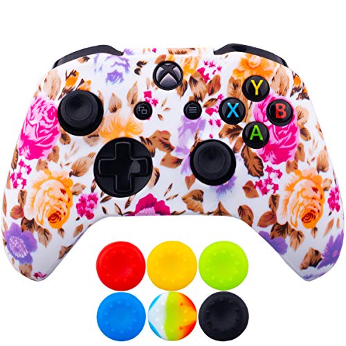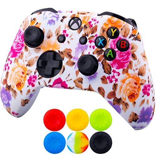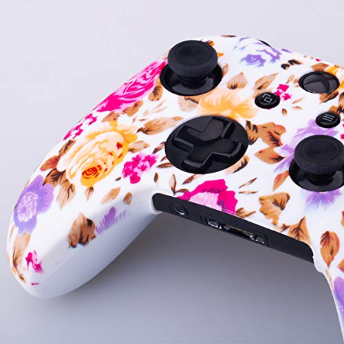 9CDeer 1 x Silicona Transferir Impresión Protector Cubrir Piel + 6 Apretones de Pulgar y Tapones a Prueba de Polvo para Xbox One/S/X Mando Flores Rosadas