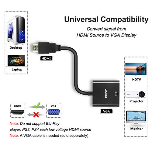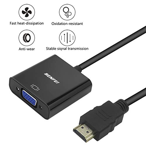 - Diseño compacto: el adaptador portátil de HDMI a VGA de Benfei en diseño compacto conecta una computadora, computadora de escritorio, portátil u otros dispositivos con puerto HDMI a un monitor, proyector, HDTV u otros dispositivos con puerto VGA; coloque este dispositivo liviano en su bolso o bolsillo para dar una presentación comercial con su computadora portátil y proyector, o extienda la pantalla de su escritorio a un monitor o televisor