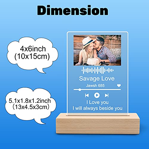 - ❤ Material de alta calidad de Placa Spotify❤-- Cuadros marco spotify está hecho de plexiglás acrílico nuevo + base de madera acrílica.Con un diseño hecho a mano único, la impresión fotográfica exquisita mejora la belleza de la luz nocturna del código Spotify personalizado, y también muestra tu amor o amistad. a tus seres queridos.Placa musica personalizada tamaño: 10 * 15cm