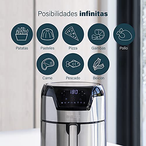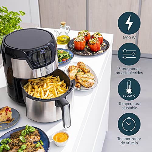 - Prepara tus platos favoritos con menos calorías pero conservando el mismo sabor; Si no conoces la temperatura y el tiempo de cocinado perfectos, puedes iniciar uno de los 8 programas con tan solo pulsar un botón; patatas fritas, carne, pescado, gambas, etc;