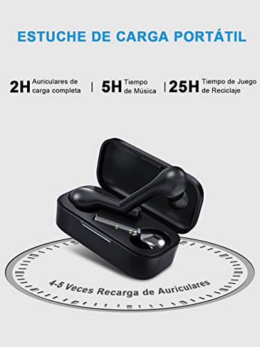 - Bluetooth 5.0 y 25 horas- Un chip de alta tecnología con el ultimo bluetooth 5.0 asegura una transmisión estable y rápida sin cortes. Sobre 4-5 horas por cada carga y 5 cargas adicionales en la batería de la caja de transporte para alargar tu experiencia con ellos. Es suficiente para cualquier uso como llamadas, música, ejercicio.