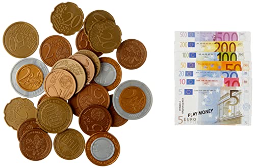 - 160 monedas de tamaño original de plástico: 20 x 1, 20 x 2, 20 x 5, 20 x 10, 20 x 20, 20 x 50 céntimos y 20 x 1 y 20 x 2 euros