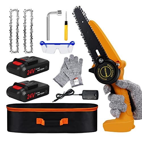 FULLOVE Motosierra de poda, Motosierra Eléctrica Bateria, Mini Motosierra eléctrica de 6 pulgadas con 2 baterías y cargador Motosierra de jardín portátil inalámbrica recargable con una mano, amarilla