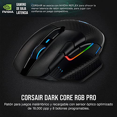 Corsair Dark Core RGB PRO, Ratón para Juegos Inalámbrico/Cable, Sensor Óptico de 18.000 PPP, Tiempo de Respuesta Rápido, Ocho Botones Programables, Retroiluminación Dinámica Multicolor, Negro
