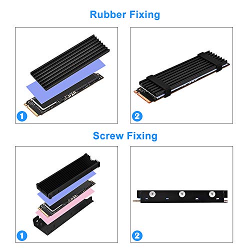 - Paquete: 1 disipador de calor de fijación de tornillos, 1 disipador de calor de fijación de banda de goma, 4 almohadillas de silicona térmica, 2 anillos de goma resistentes al calor, 1 paquete de tornillos, 1 kit de limpieza.