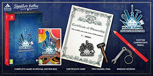 - House Flipper - Signature Edition incluye: Juego completo, 2 Pins exclusivos, Llavero Llave Inglesa, Lápiz de Carpintero personalizado, Certificado de Autenticidad Numerado y una Caja Especial de Coleccionista