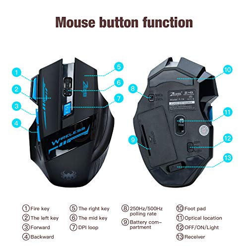 - 【Diseño Fresco】: luz azul LED y diseño fresco de araña, estilo cyborg de moda, rueda de desplazamiento ultraprecisa. La tecnología inalámbrica de 2.4GHz garantiza un funcionamiento sin problemas y le permite disfrutar de juegos inalámbricos.