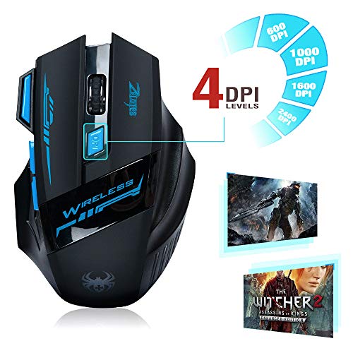 Ratón gaming inalámbrico óptico, Lychee 2.4GHZ con 7 botones 2400 DPI ajustable LED azul ratón óptico para juegos ratón para portátil, PC, Mac, ordenador portátil (negro)