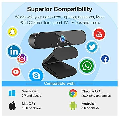- Alta compatibilidad: la cámara web para ordenador tiene alta compatibilidad y se puede utilizar en ordenadores portátiles, de sobremesa, Mac, Android TV, Xbox, etc. USB Plug and Play, no requiere controladores, puerto USB 2.0/3.0. Funciona con Windows XP/7/8/10 o superior, Mac OS 10.6 o superior. Soporte para Smart TV, caja de TV, Chrome OS, Android V5.0 o superior, etc.