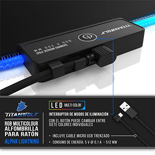 - ¡Disfruta de un colorido y de unos efectos sorprendentes en tu propio escritorio! La alfombrilla para ratón de 800 x 300 mm ofrece una iluminación en 7 colores vivos RGB. Tus amigos se quedarán boquiabiertos. Solo tienes que conectar la alfombrilla en tu ordenador con el cable USB incluido y serás el centro de atención en cada torneo LAN multiplayer | 303676