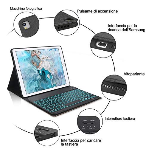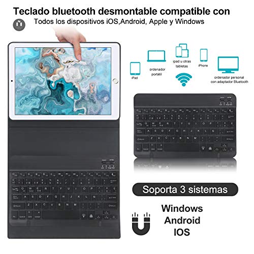 - Teclado Bluetooth desmontable y retroiluminado:Teclado español con todas las letras y símbolos españoles. 3 niveles de brillo y 7 colores vibrantes hacen que escribir sea divertido y fácil en la oscuridad o la luz. El teclado ipad 10.2 se puede conectar a la carcasa magnéticamente, si no es necesario, se puede quitar, la conectividad Bluetooth es fácil.