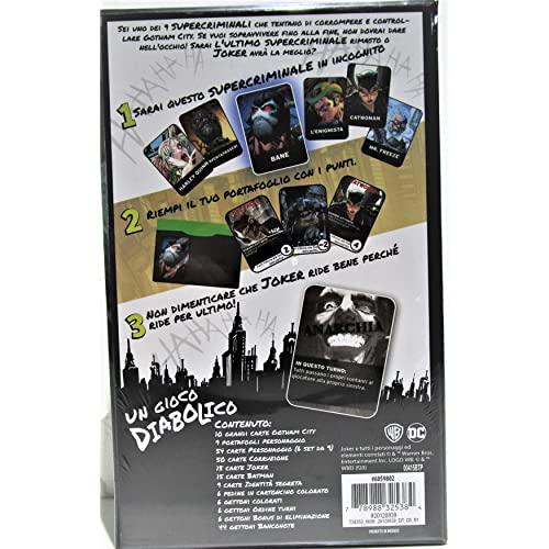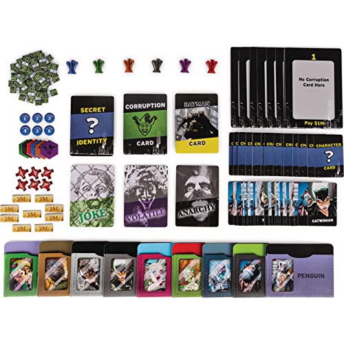 - La caja contiene 54 cartas ilustradas supercriminales, 10 cartas con Gotham City, 9 tarjetas cartera, 15 cartas Joker, 15 cartas Batman, 9 tarjetas de identidad secreta, 50 tarjetas de corrupción, peinas y dinero