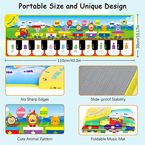 - Diseño Lindo y Varios Sonidos: Una alfombra de piano grande y bien hecha, con lindos patrones de trenes y animales, realmente atrae mucho a los niños pequeños. Y el juguete musical incluye 8 sonidos de animales (elefante, león, gato, etc.), 3 instrumentos (piano, violín y xilófono), 10 canciones y 10 teclas. ¡Todo esto mantendrá a tu pequeño entretenido y encantado!