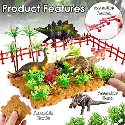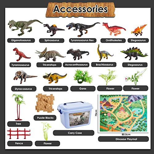 - 58 pcs dinosaurios juguetes incluidos 12 x figura de dinosaurio: T-Rex, triceratops, brontosaurus, braquiosaurio, ect. 11 x césped, 6 x flores y árboles, 12 x barandillas, 16 x rompecabezas de tierra, 1 x tapete de Juego.
