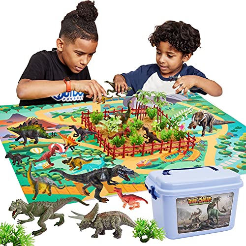 BUYGER 58 Pcs Dinosaurio Juguetes con Tapete de Juego y Arboles, Tyrannosaurus Rex, Spinosaurus, Juego de Dinosaurios Regalos para Niños Niña 3 4 5 Años