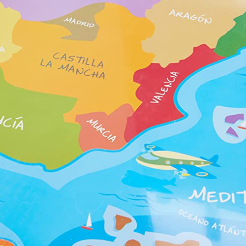 - MAPA DE ESPAÑA CON ROMPECABEZAS: Cada imán representa una provincia, con su capital y una ilustración de una especialidad loca; El gran tablero magnético representa el mundo con sus continentes, mares y océanos: el color usado para cada región te ayuda a encontrar tu camino