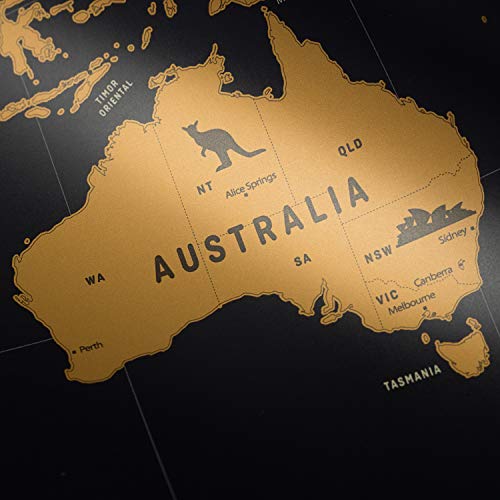 - PRODUCTO DE PRIMERA CALIDAD: Papel sólido (gramaje 300 g / m²) y laminado de alta calidad con laca dorada y negro mate. Calidad de impresión de alta resolución con colores brillantes. Tamaño ideal para tu pared 82 x 43 cm (32.2 "x 17"). El mapa del mundo a rascar es perfecto para tu pared.