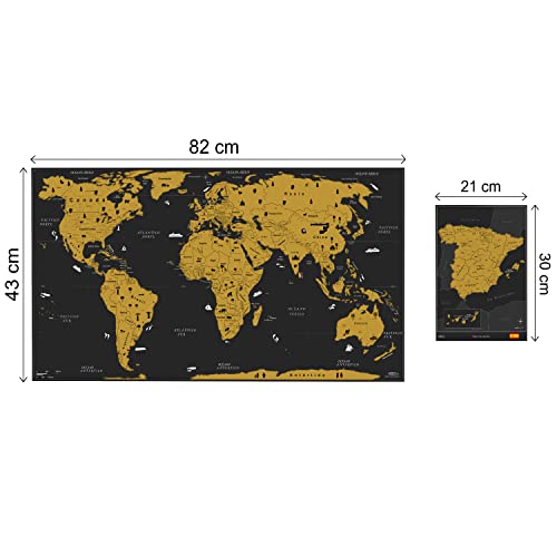 - ?ORO METÁLICO DE 68x43 cm: la combinación de colores perfecta para un mapa rascable. Gracias a su diseño atemporal, el mapamundi rascable queda perfectamente en cualquier habitación. Auténtica pintura metálica para rascar, sin colores claros.
