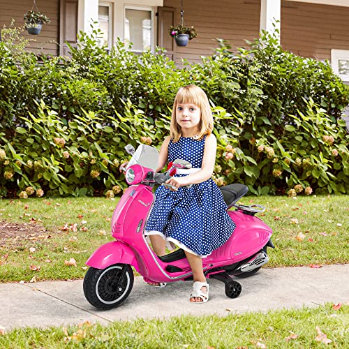 HOMCOM Moto Eléctrica Vespa Faros Música 2 Ruedas Auxiliares para Niños Mayores de 3 Años Motocicleta Infantil Autorizada 108x49x75 cm Rosa