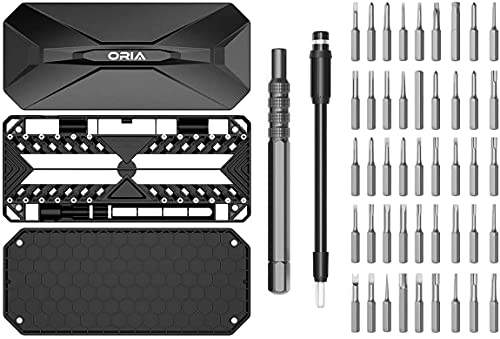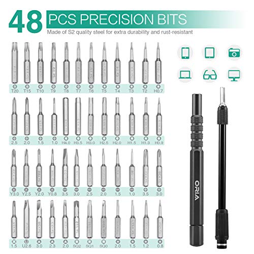 - 【50 en 1 Juego de Destornilladores Mejorado】 ORIA juego de destornilladores de precisión actualizado de nueva versión incluye 48 puntas largas (28mm de longitud), mango de destornillador y manguera de extensión, que puede reparar la mayoría de los equipos electrónicos