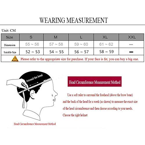 - Tamaño: código S 52 – 53 cm, código M 54 – 55 cm, código L 56 – 57 cm, código XL 58 – 59 cm. Por favor, lee el esquema de medidas en la imagen con cuidado. Si tienes una cara grande, elige una talla más grande.