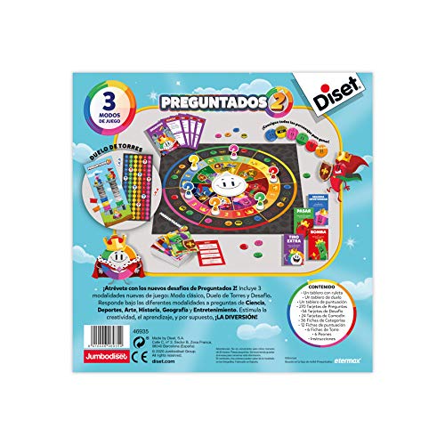 - Contenido: tablero con ruleta, tablero de duelo, tablero de puntuación, 270 tarjetas de preguntas, 54 tarjetas de desafĆo, 24 cartas de comodĆn, 36 fichas de categorĆas, 6 fichas de torre y 6 peones y instrucciones