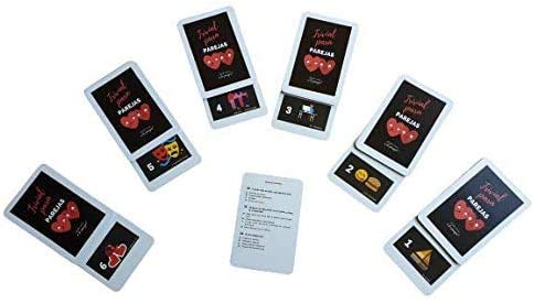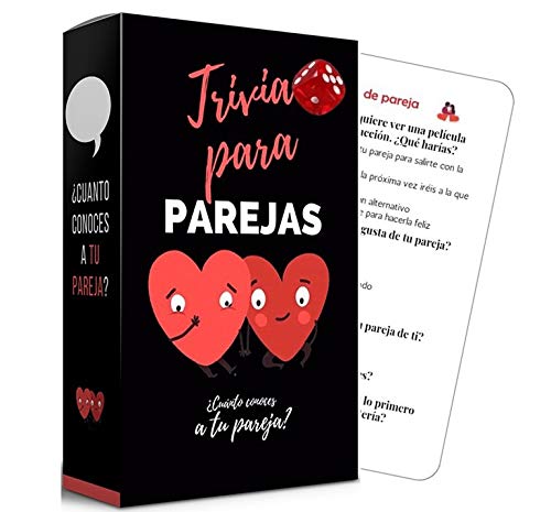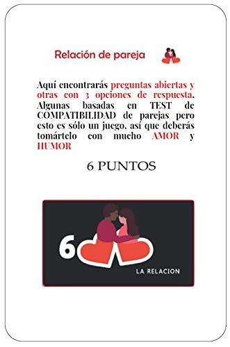 - ⤠JUEGO DE CARTAS PARA PAREJAS DIVERTIDOā¤: Se trata de un juego de cartas (72 cartas tamaƱo Tarot) con 260 preguntas. NO necesitas tablero ni dado ya que se acciona a travĆ©s de una ruleta que encontrarĆ”s en la web (www.trivialparaparejas.com). Es un juego de cartas para averiguar cuanto conoces a tu pareja a traves de preguntas divertidas y estimulantes, clasificadas en 6 categorĆas.