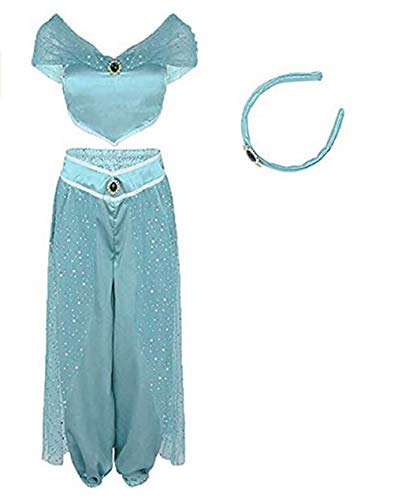 Niña Aladdin Princesa Jasmine Disfraz jazmín Tops Pantalones Manga Corta Traje Cosplay Actuación Carnaval Navidad Regalo Cumpleaños Danza Vientre Vestido de Princesa (Azul Claro, XXL)