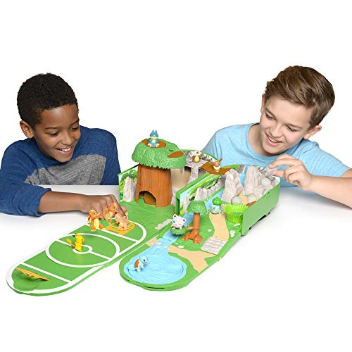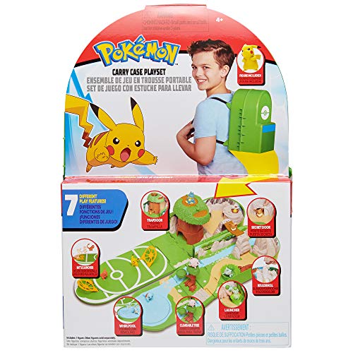 - El juego con estuche de transporte Pokémon tiene una escala apropiada para figuras Pokémon de 5 cm. Cuando hayas vivido tu aventura, se pliega fácilmente en forma de la icónica mochila Kanto de Ash. No solo es perfecta para guardar de forma segura todas tus figuras Pokémon en un solo lugar, sino que también tienes el escenario para jugar donde quiera que vayas