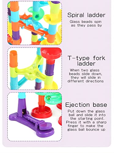 - Kit de construcción de carrera de mármol, incluyendo tuberías, bases, escaleras en espiral, embudos giratorios, escaleras bifurcadas en forma de T, bases de expulsión y canicas transparentes. Recomendado para niños y niñas de 4 años o más, los niños pueden fácilmente jugar en equipos y construir por sí mismos.