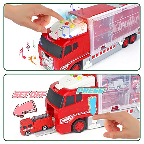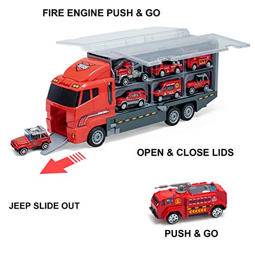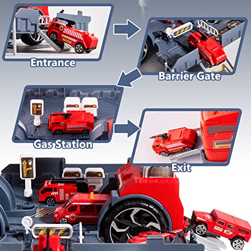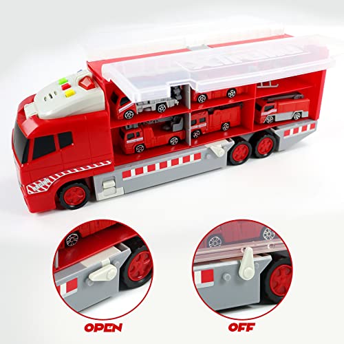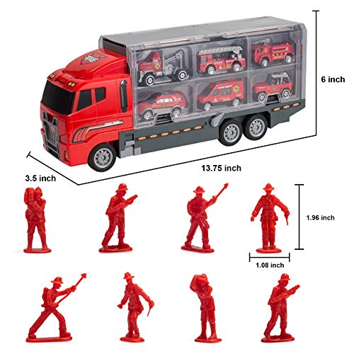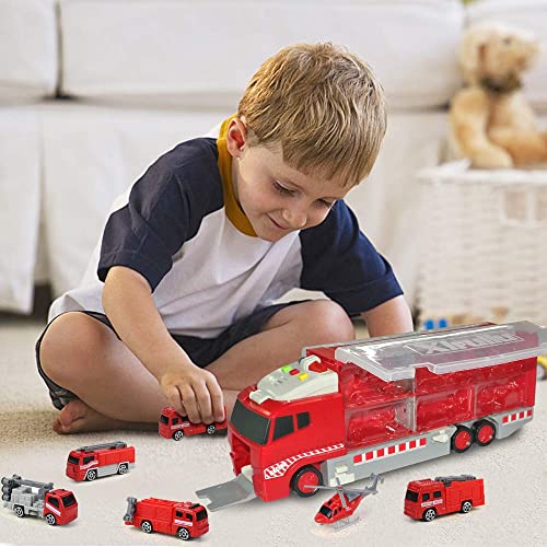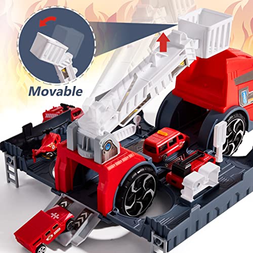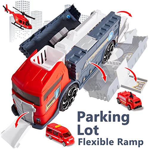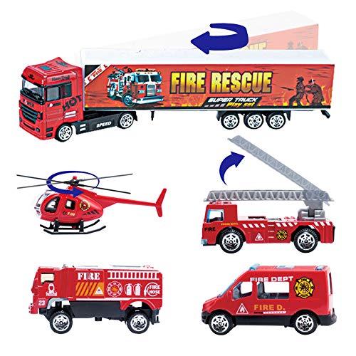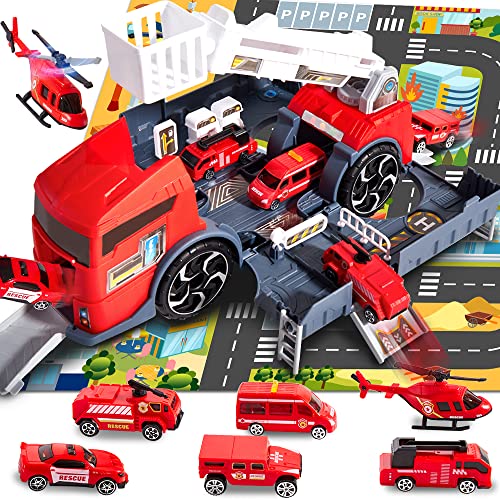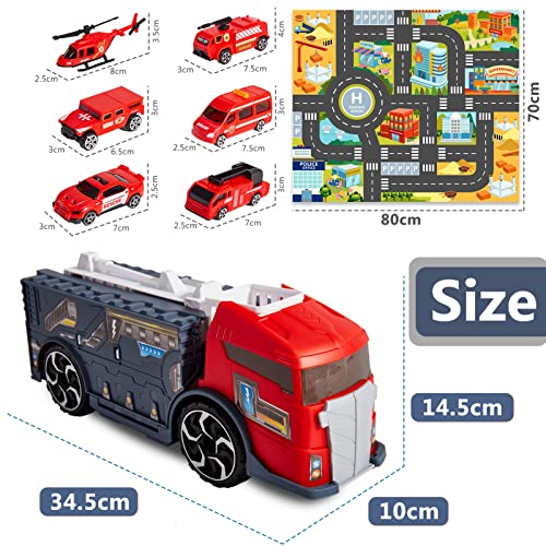 HERSITY Camión de Transporte Juegos de Imitacion con 6 Mini Coches de Bomberos y Tapete de Juego para Niños Niñas