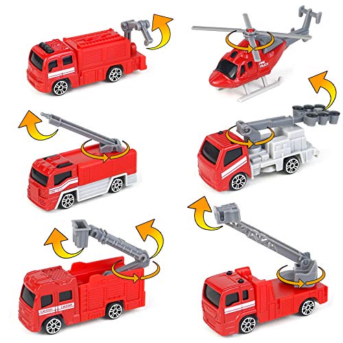 - COCHE JUGUETE SET: 5 mini camion bomberos juguete, 1 helicóptero y 2 juegos de señales de tráfico en diferentes diseños y funciones en 1 camiones grandes de juguete. Mantiene a los niños entretenidos durante horas para que jueguen imaginativamente con carros de juguete.