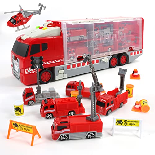 Camion Bomberos Juguete Coches Juguetes Niños 3 4 5 años Camion Transporte Coches Incluye 5 Mini Camion Bomberos,1 Helicóptero Juguete y Señales de Tráfico Juguetes Regalo Niños Niña 3 4 5 Años