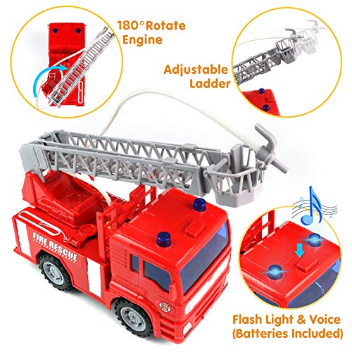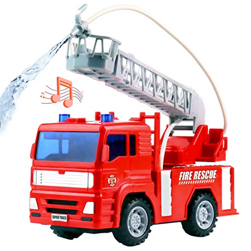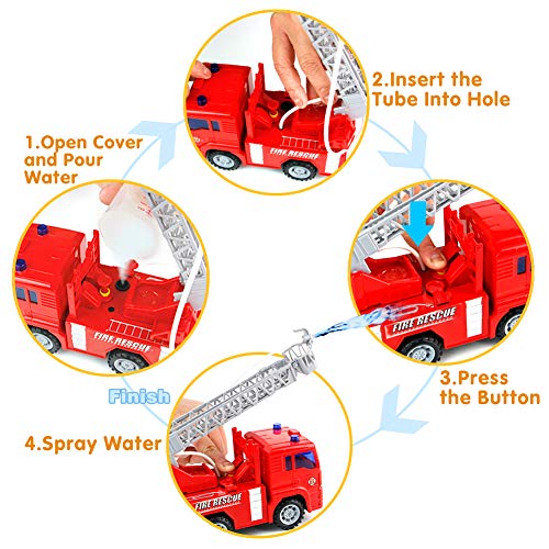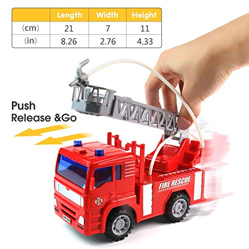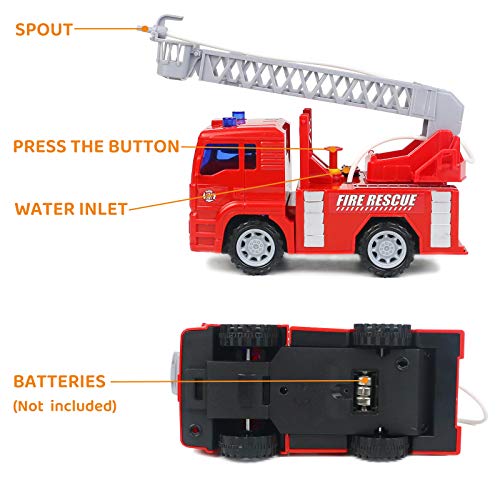 - Camión de juguete de bomberos con inyector de agua: no es solo un modelo de juguetes de camión de bomberos. Vierte agua en los coches de juguete de bomberos, presiona el botón, los juguetes para niños y niñas rociarán agua. Los niños pueden tener un juego de rol realmente con los juguetes de coches, ajustar la dirección de la escalera y hacer que el camión de bomberos rocíe agua.