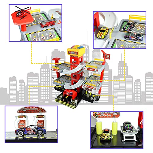 - Parking Juguetes Coches para Infantil: El garaje coches juguete incluye 1 pista de coches, 6 estacionamientos pequeños, 1 elevador de estacionamiento, 12 coches de juguetes y 1 helicóptero de juguete rojo. Con una gran capacidad de juego, los niños pueden divertirse durante horas.