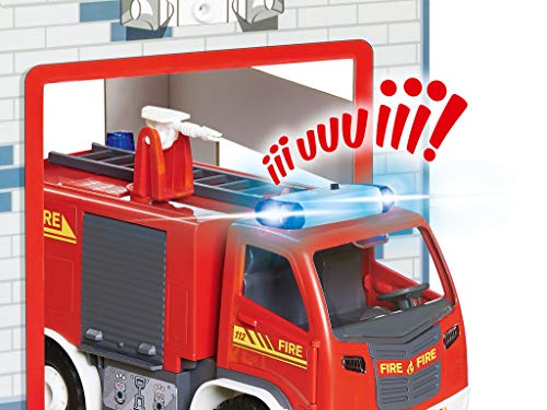 - Estación de bomberos con tobogán y puerta grande, un coche, una figura de juego, luz azul, sirena y otros accesorios (pilas incluidas)