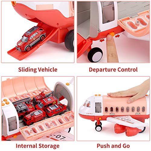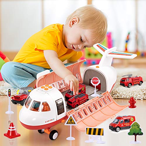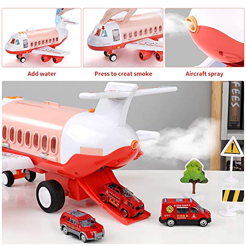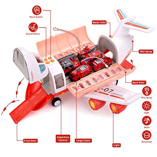 TEMI Avión de transporte con 6 mini camiones de lucha contra incendios fundido y tapete de juego para niños de 3 a 6 años de edad, avión de juguete educativo temprano con niebla Spay, música y luz.
