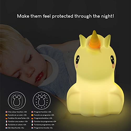 - ? 100% SEGURA PARA LOS NIÑOS ? Luz infantil nocturna de mesita de noche tamaño grande 11,2 x 11,5 x 16 cm de silicona blanda muy suave y libre de BPA, se puede desmontar y lavar a mano para mantenerla limpia e higiénica. Luz led para dormir regalo original para niñas y niños para protegerlos de la oscuridad en la noche. Unicornios para niñas